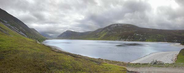 The water level in the loch was low enough to show the shingle beach on this visit. A subsequent visit showed the water completely covering the shingle. Here you see my bike propped up against some stones bottom right.