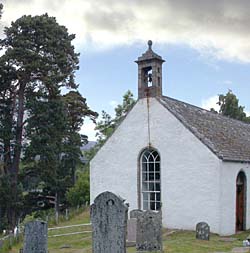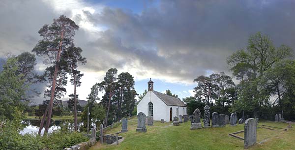 Here You see Loch Insh on the left, through the trees. The Church is on a hill with quite a few steps up to the churchyard from the road which is at the level of the loch. Access by car is from the camera viewpoint side, into a small car park at the top next to the church.