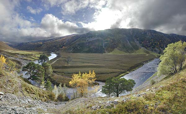Craig na Cailich looking west across the Feshie some 9 miles upstream of Feshie Bridge. You can see the scale of this view from the Landrover tracks that make their way along the right bank. The tracks originate from one of two fords across the river within 100 yards of each other. This is a long, unspoiled and beautiful glen.